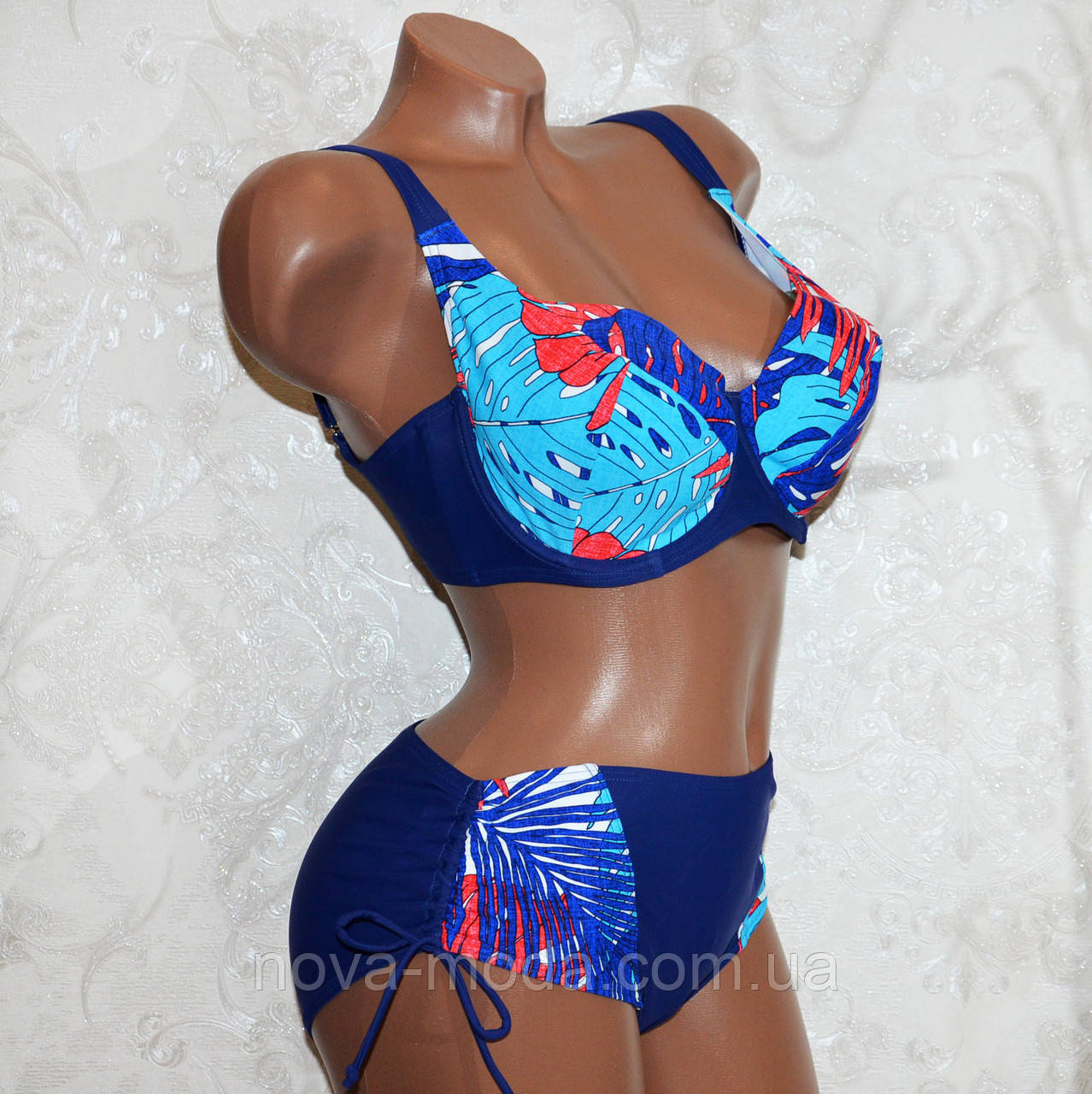 Шикарна модель жіночого купальника поточного року на великі груди. Гарний дизайн, темно-синє забарвлення з бірюзово-синіми пальмовими листям.